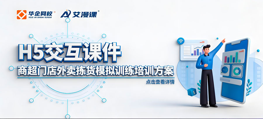 了解H5交互动画课件:商超门店外卖拣货高强度模拟训练解决方案更多详情点击关注我们【华企网校】。